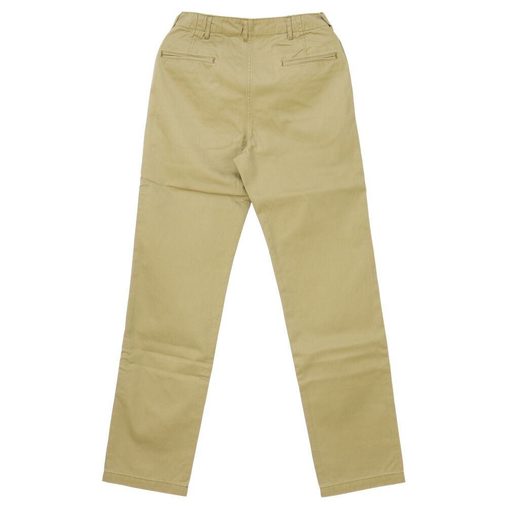 フロントのボタンフライ仕様やサイドの2本針縫製、両玉縁のコインポケットやバックポケットなど、M-41チノの特徴的なディテールが施されています。