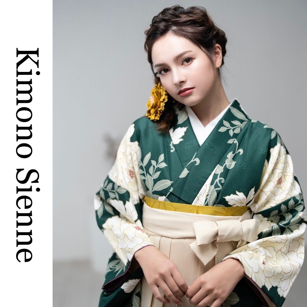 着物ジェンヌ 卒業式袴3点セット 深緑にアイボリーの牡丹 二尺袖着物 袴 卒業式