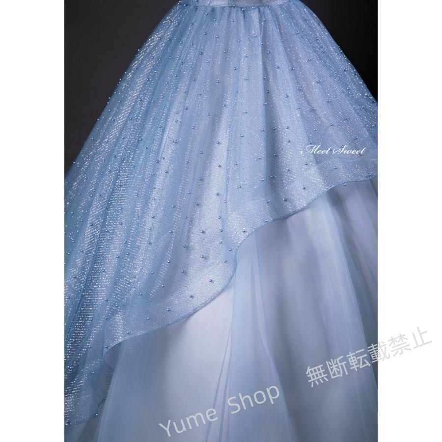 ♥ カラードレス プリンセスライン ロングドレス ブルー フリル リボン パール ウェディングドレス 結婚式 二次会 花嫁 前撮り 演奏会 発表会 ステージ衣装 nhdw 119