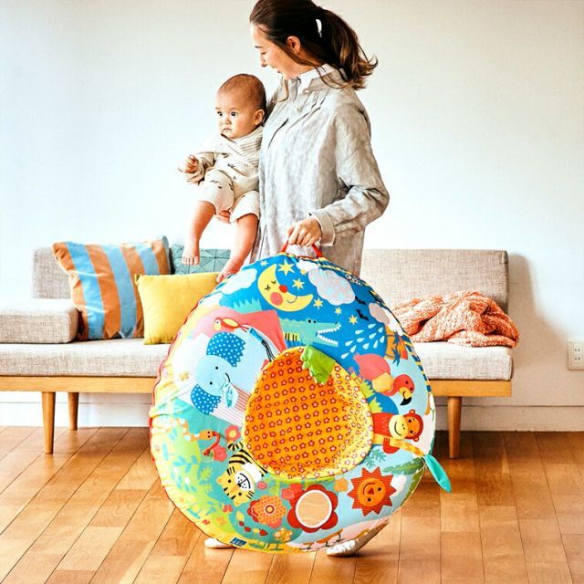 低月齢の赤ちゃんの場合は、枕としても使用できるようにチューブの中の空気を少なめに、おすわりの練習やハイハイの時期には空気を多めに入れて使います。