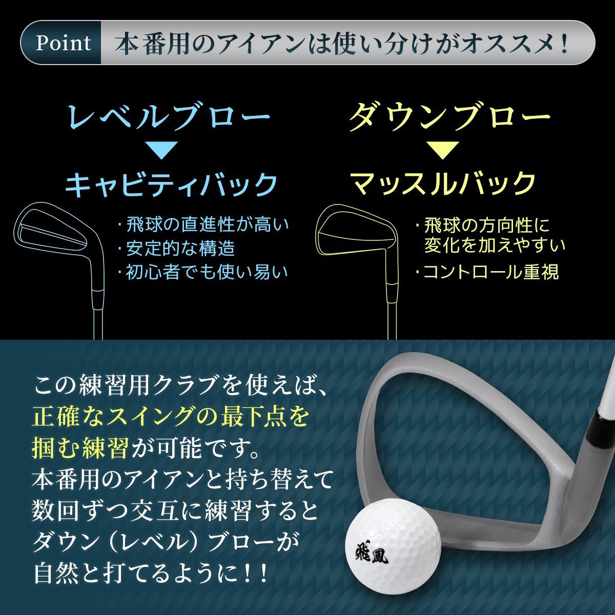 【本番用と交互に練習するのが上達への道】フェースのない練習用クラブで最下点を意識して打ち、正確に打てた時の空振りの感覚がベストインパクトになります。そのまま本番用アイアンに持ち替えれば自然とスピンの効いたショットが打てるようになります。