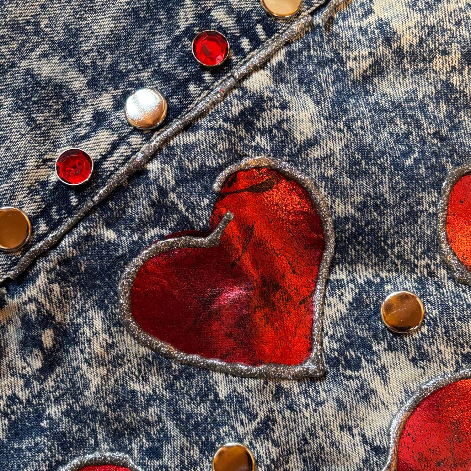 ハート柄が大胆なデザインで、ワーク感とアート性が共存する特別な仕上がりなデニムシャツです。長袖仕様としっかりした縫製で、季節を問わずコーディネートに取り入れられるおすすめのデニムシャツです。