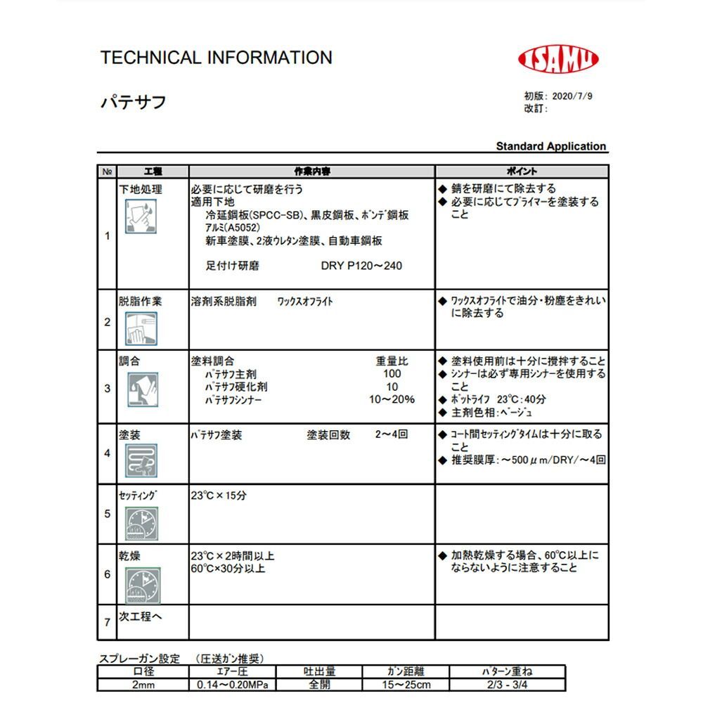 【調合比】パテサフ主剤:パテサフ硬化剤:パテサフシンナー=100:10:10~20%( 重 量 比 )