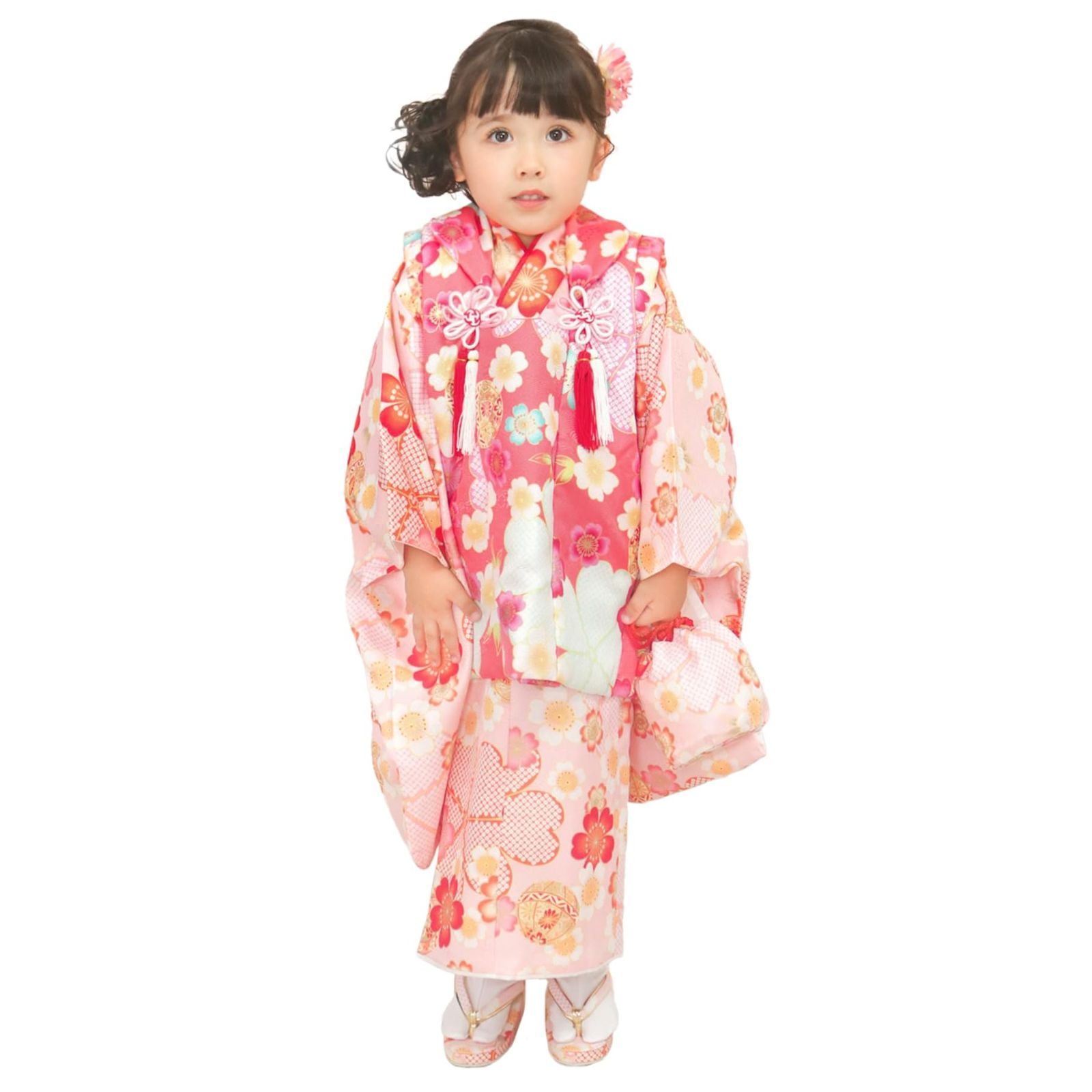 ・[サイズ]:着物身丈:76cm(腰上げ前 90cm)、着物袖丈:57cm、着物裄丈:42cm(肩上げ前 47cm)、被布コート:48cm、草履:18cm、足袋:15-16cm ※小物含め全てサイズ固定です。サイズの変更は承っておりません。