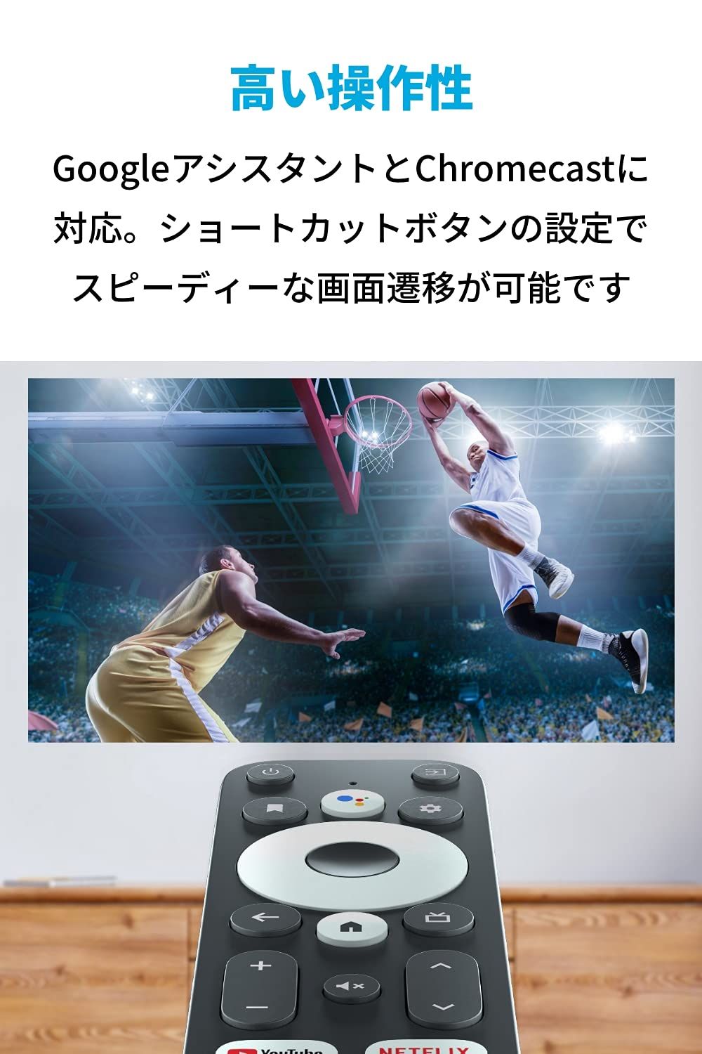 アシスタント対応のためリモコンの⾳声操作も可能です。リモコンにはYouTube、Netflix、Amazon Prime