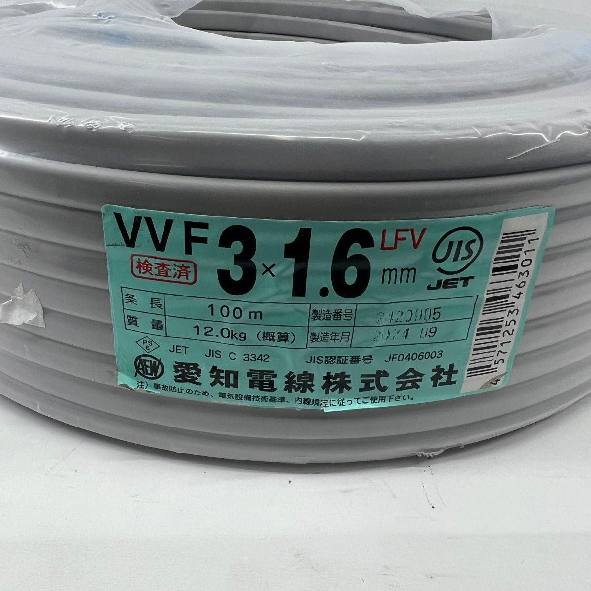 【商品名】新品 愛知電線 電材 VVFケーブル 3芯 3× 1.6 LFV 100m 未開封品 2024年9月製造