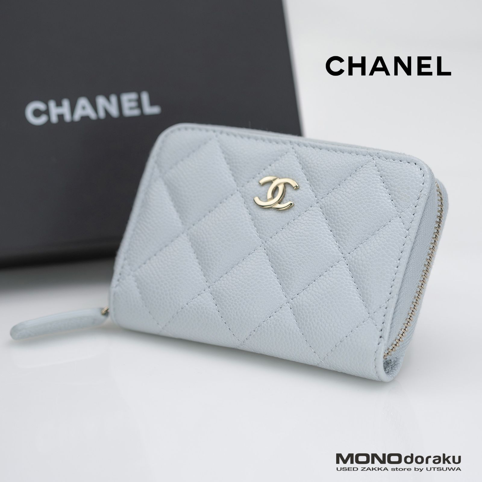 シャネル マトラッセ ココマーク キャビアスキン コインケース カードケース ライトブルー 美品 箱・保存袋付