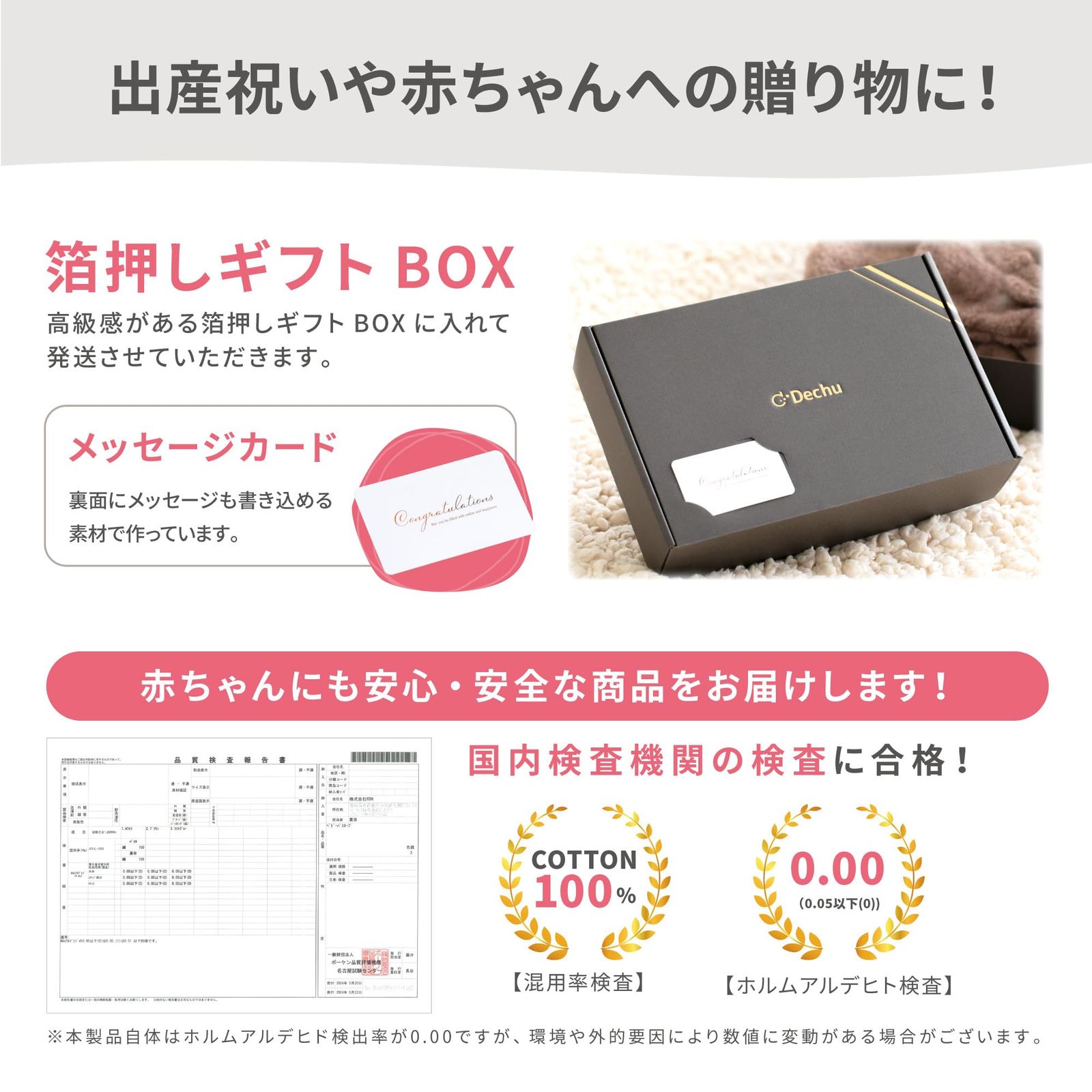 【出産祝いプレゼントに】高級感がある箔押しギフトBOXに入れて発送いたしますのでプレゼントとしても喜ばれます。メッセージカードは直筆文章が書き込める素材で作っています。