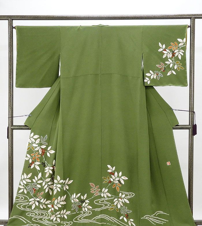 草色地に柿茶や葡萄・黒緑色などの多色や刺繍・金箔・絞りで流水南天模様が柄付けされています。
