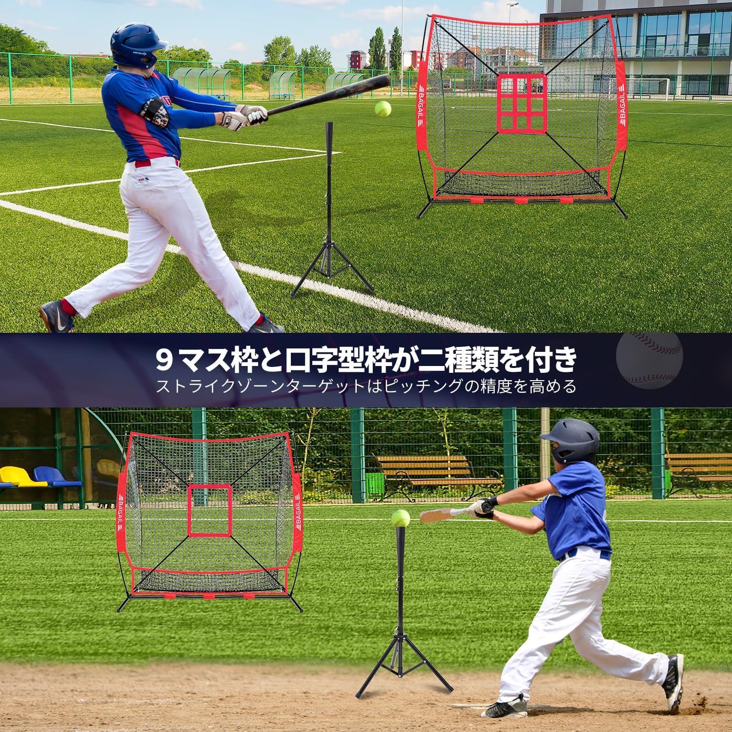BAGIL野球ネット ベースボールネット バッティングネット ピッチングネット スチール製 野球器具 硬式 軟式対応 打撃 投球 防球ネット ソフトボール練習ネット トレーニング 組み立て簡単 折り畳み 収納バック付き 9マス枠 口字型枠付