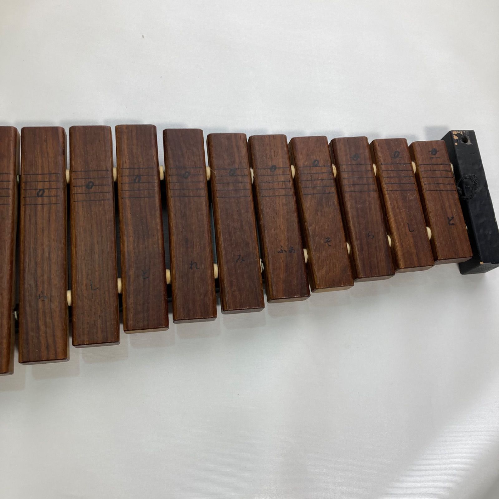 全体的に傷や汚れ、使用感ありです。木琴同士を繋ぐための木が片方折れています。