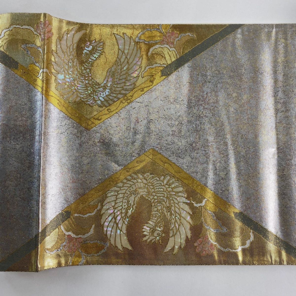 袋帯 秀品 鳥 草花 螺鈿箔 箔 銀色 お太鼓柄 正絹