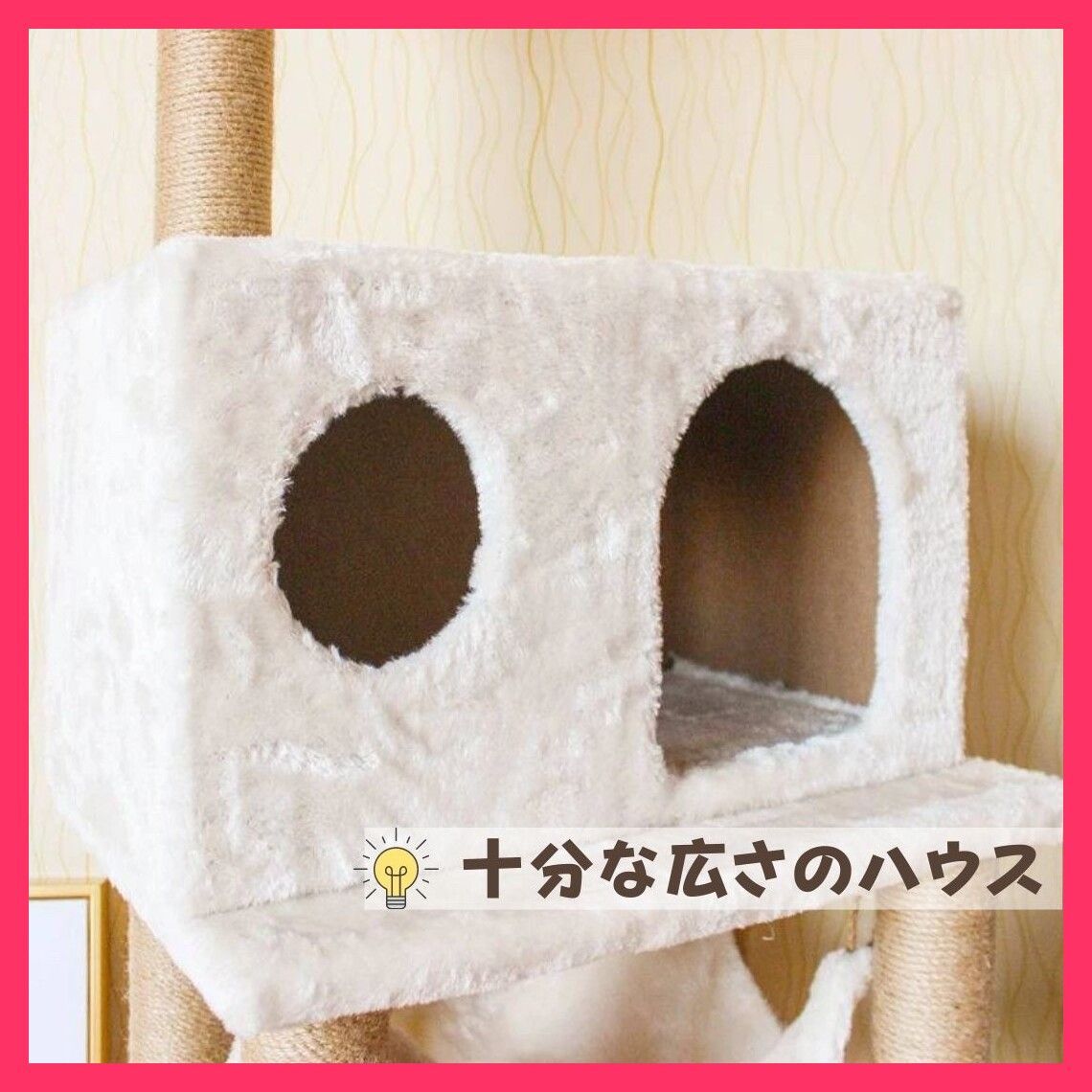 見守りやすい高さ130cm、安定感があるので安心して遊べます。それぞれの猫ハウスには専用のふかふかクッション付き