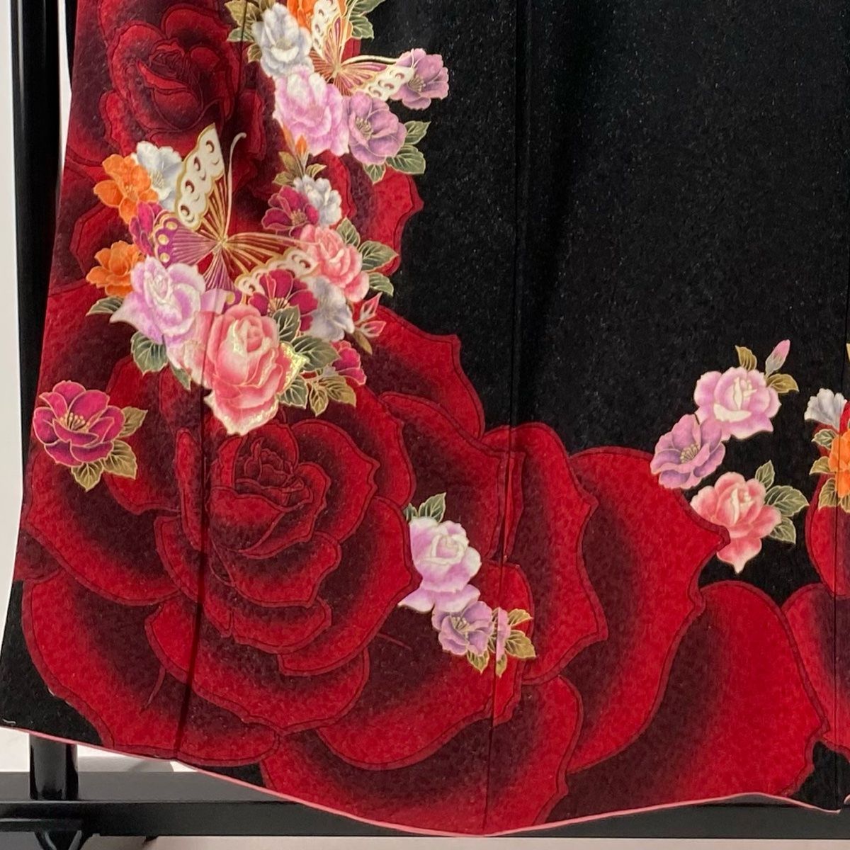 振袖 身丈155.5 cm 裄丈63.5 S 袷 薔薇 蝶 銀通し 金彩 黒 正絹