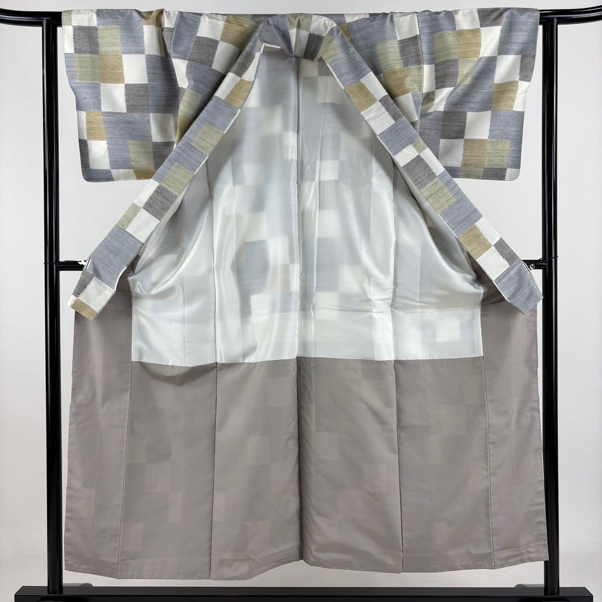 紬 身丈152.5 cm 裄丈62 S 袷 変わり市松 灰色 正絹 秀品