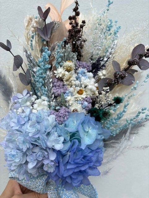 #ドライフラワー#インテリア#花#白#シルバー#水色#スワッグ#ブーケ#ウエディング#ウエディングブーケ#かわいい#おしゃれ#高級#ウォールデコ#壁掛け#お祝い#プレゼント#テールリード