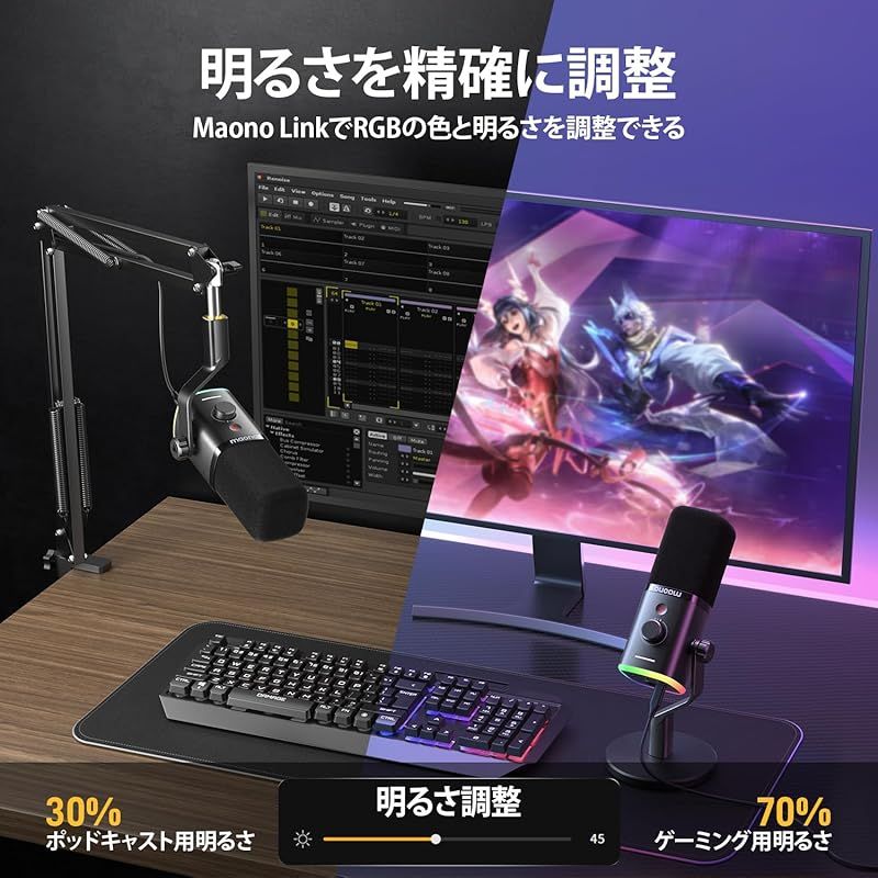 【ゲーミング空間を彩りRGBライティング】このUSBストリーミング用ゲーミングマイクには、3つのモードと9色のオプションを備えた独特のRGBデザインが搭載されています。カスタマイズ可能な静的および動的なRGBライティングエフェクトを使って、お使いのPCに合わせて演出を調整できます。Maono linkソフトウェアまたは底部のRGBボタンを使用して、色や明るさを簡単に調整したり、ライトをオフにすることができます。(USBモードのみ)