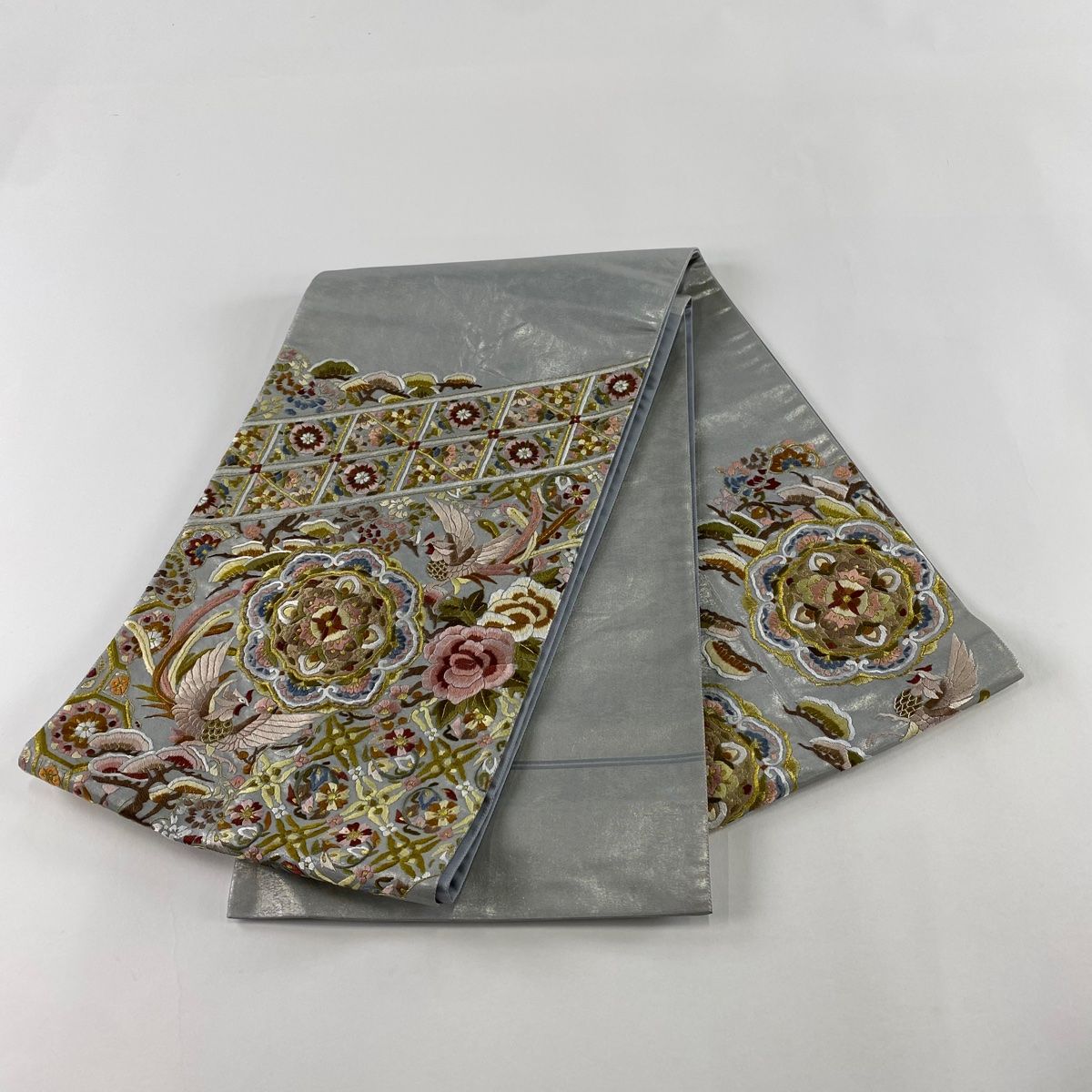 袋帯 秀品 華文 鳳凰 刺繍 金糸 灰色 お太鼓柄 正絹