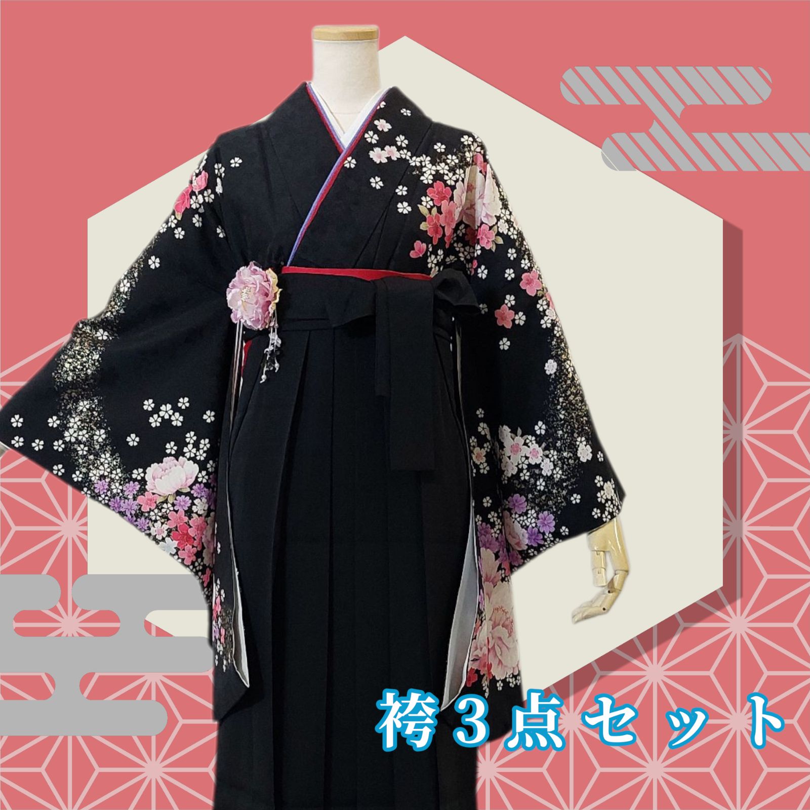 着物 袴 帯 3点セット セット販売 卒業式 に レディース袴セット 成人式 卒業式に 華やか和装 黒 ブラック 桜 花柄 95-12