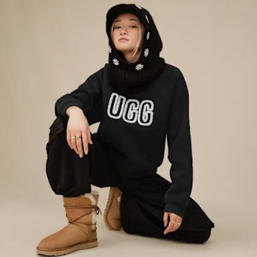 シェニールニットヤーンのUGGグラフィックフォントをあしらったラグランスリーブスウェットシャツです。