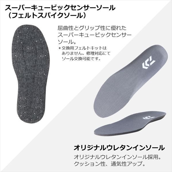 足の疲れを軽減させるオリジナルウレタンインソール等、新機能を搭載してリニューアル!屈曲性とグリップ性に優れており、河口やゴロタ場、磯場まで対応可能なスーパーキュービックセンサーソール(フェルトスパイクソール)搭載。◆オリジナルウレタンインソールを採用。クッション性と通気性があがり、長時間ウェーディングした際の足の疲れを軽減。◆体格がいい方向け待望のO体が新ラインナップ※LとLOでは、胴回りが約18cm大きくなっています。◆藪漕ぎなどのタフな使用に耐えるリップストップナイロンを採用。◆タイトフィットモデルでありながら、立体裁断にすることで、流水抵抗を抑えつつも機動性が高くなり、快適な釣行が可能。◆内側は肌離れが良く、ベタツキを最小限に押さえるスーパーメッシュを採用。◆屈曲性に優れ、紫外線劣化に強い一体成型のPVCブーツを採用。機動性の高いショート丈仕様。
