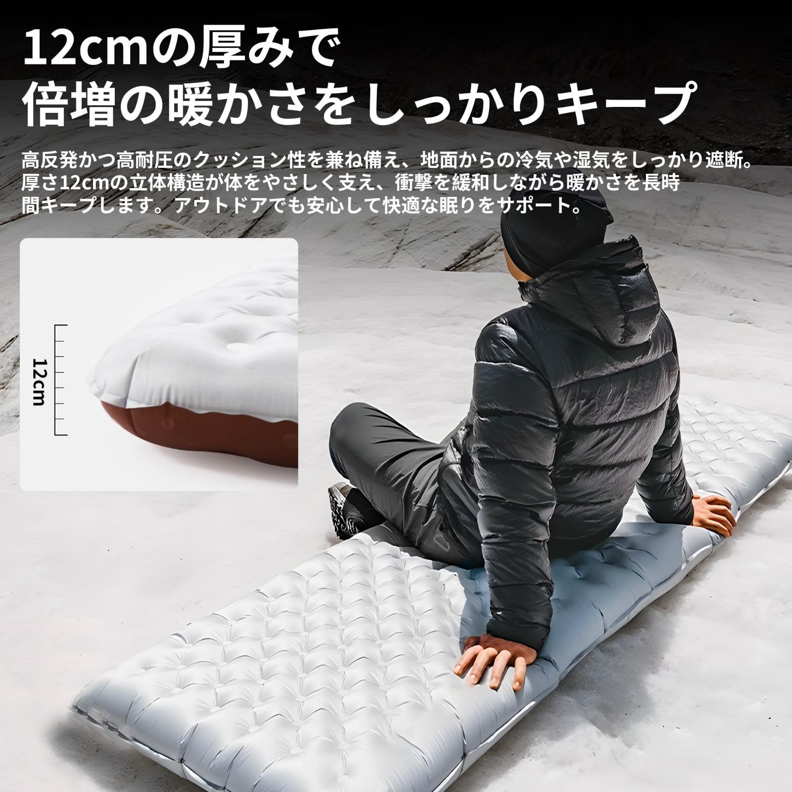 【12cm極厚エアマットで快適な寝心地を実現】?スペースフレーム構造により、約12cmの極厚設計を実現。一点に荷重が集中しても底付きしにくく、しっかりとしたサポート力で快適な寝心地を提供します。さらに、波型グルーブ構造が体に優しくフィットし、寝返り時の摩擦音を軽減。まるで自宅のベッドのような静かで落ち着いた睡眠環境を作り出します。?高い弾力性・耐圧縮性・防湿性・耐衝撃性を兼ね備えた構造で、寒さにも強く、体をしっかり支えて深い眠りへ。使用時サイズは190cm×65cmとゆったり設計で、寝袋との併用や車中泊にも最適。ミニバンやワンボックスカーでも快適に使え、アウトドアの疲れをしっかり癒して翌日の活動に備えられます。