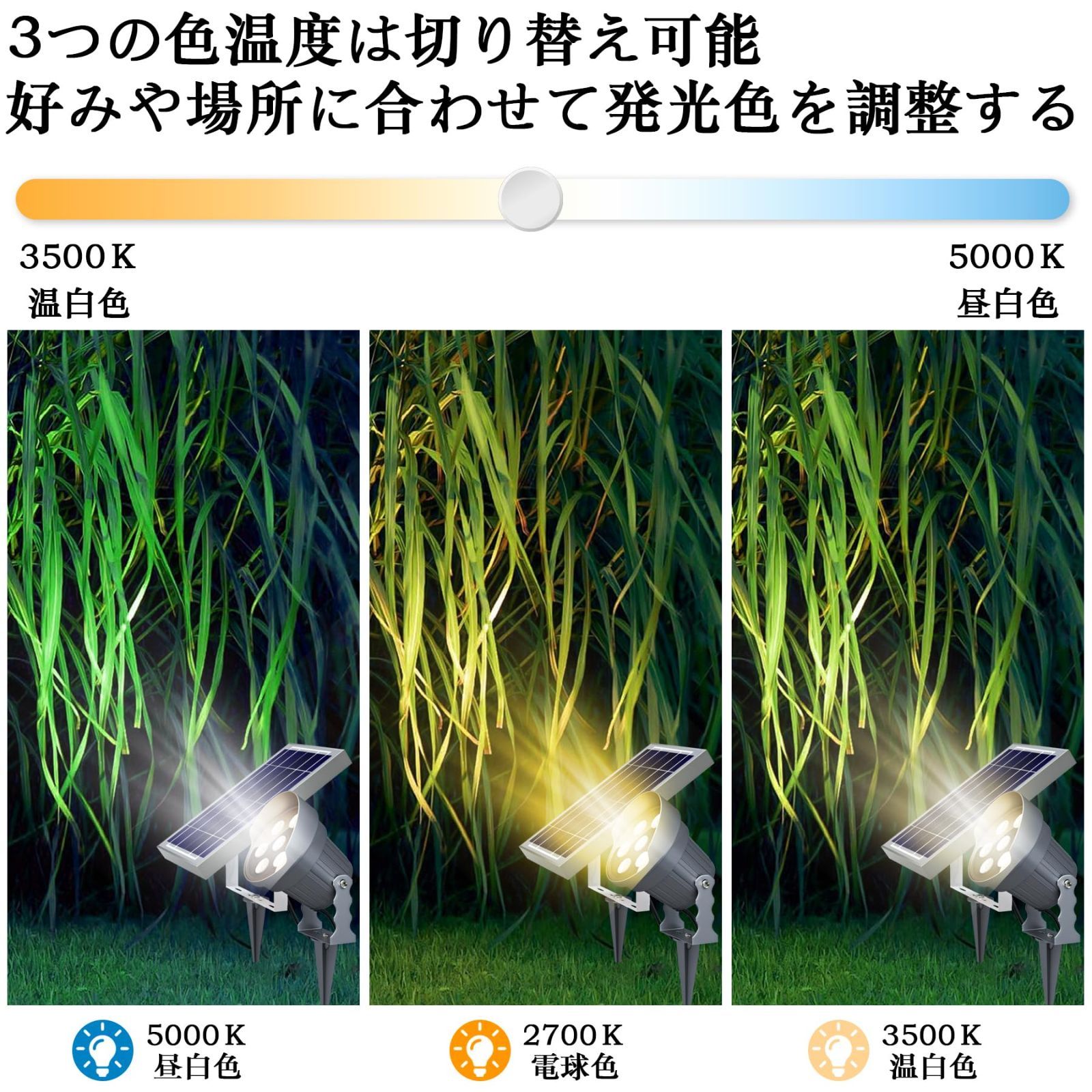 【自動点灯消灯&三色切り替え&配線工事不要&0電気代】分離型ソーラーパネルを採用し、5200mAh大容量バッテリが内蔵されて、連続照明時間は普通版のソーラーライト 屋外より遥かに長いのです。昼間の際に、ソーラーパネルは太陽光を吸収します。夜間の際に、太陽光エネルギーを電力に変換して自動点灯する。三色切り替え可能で、一回目押すと:5000k昼白色で光る。二回目押すと:2700電球色で光る。三回目押すと:3500k温白色で光る。四回目押すと、ライトは消灯する。大自然のエネルギーを利用して、電力を取るための配線工事がなくて、0電気代を実現します。4~5時間で強力な太陽光を当てて満電になる。