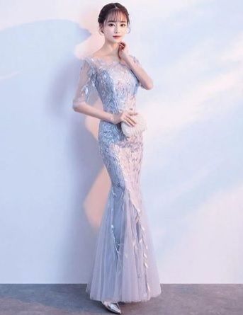 チュールのマーメイドドレス。サテン地に鮮やかな銀の小さなスパンコールをつなげた刺繍が施されたチュ-ルを重ねた豪華なデザイン。くびれたウエストがセクシーさを醸し出しています。パーティやライブ、イベントなど華やかなシーンに。デザイン上伸縮性はそれほどなく体のラインにフィットしたシルエットです。背中ファスナー有。裏地なし。胸パット有。