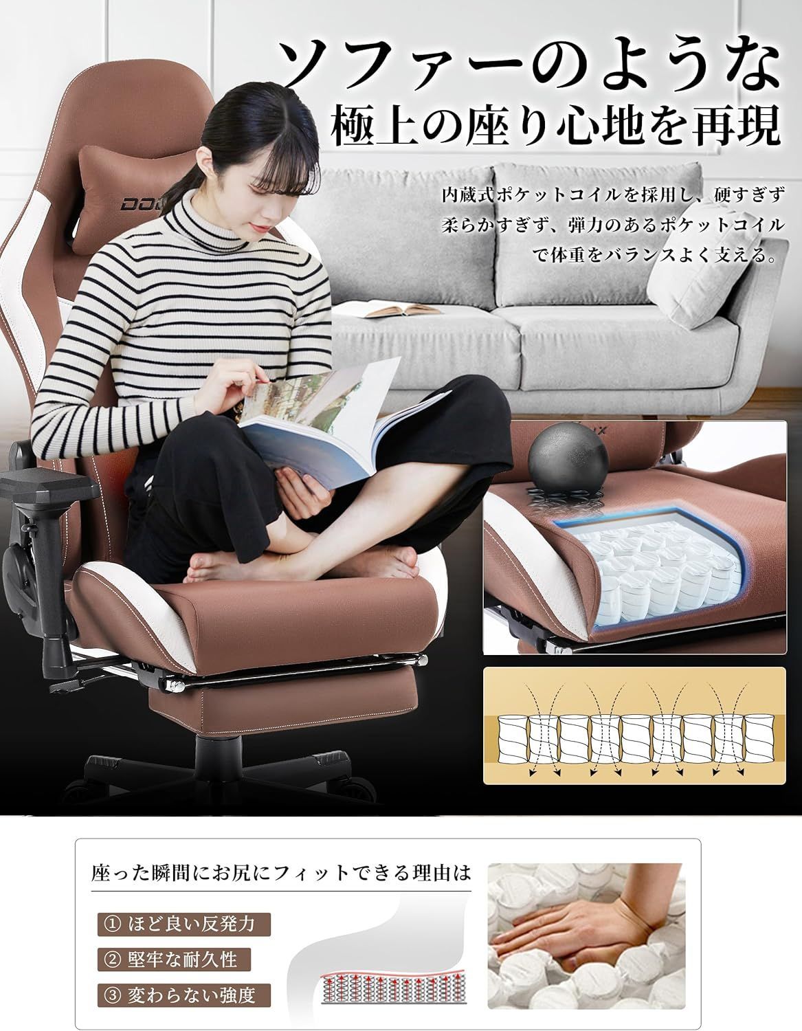 Dowinx ゲーミングチェア ファブリック オットマン付き オフィスチェア パソコンチェア リクライニング 4 Dアームレスト デスクチェア ゲーム用チェア フットレスト ヘッドレスト ランバーサポート ポケットコイル ブラウン LS-6668 B-05